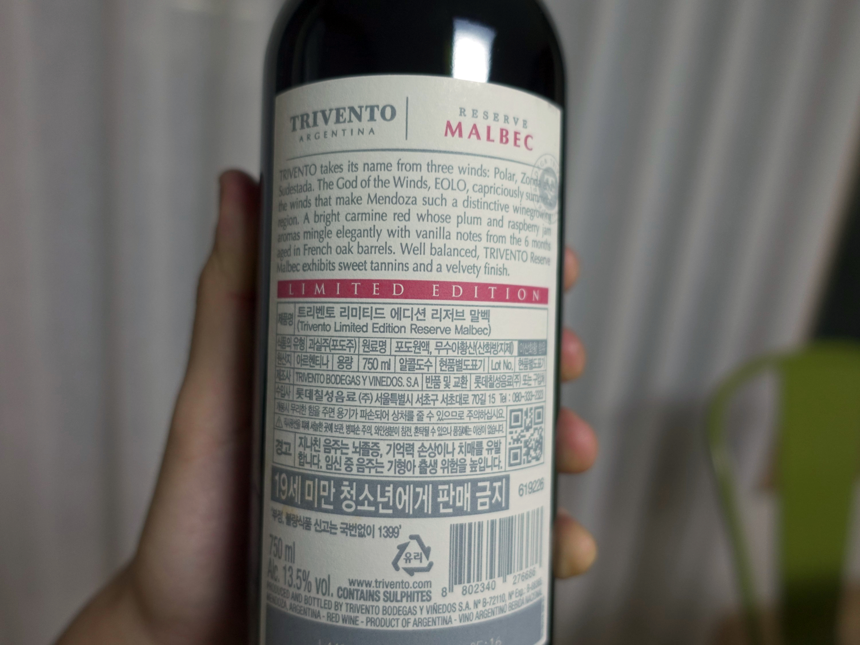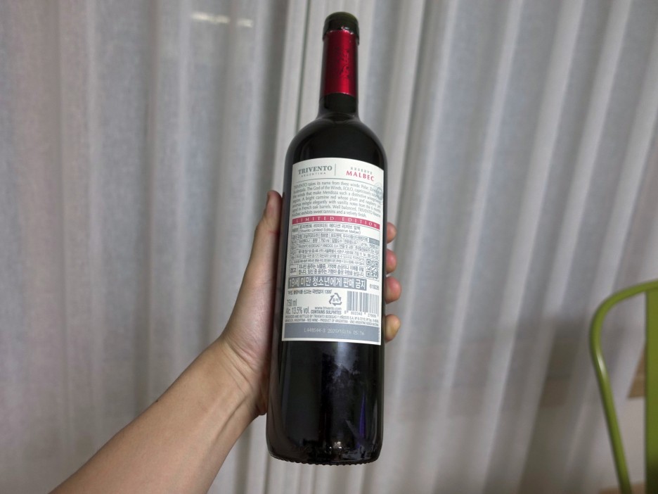 레이블에서 보여지듯 굉장히 심플한 레이블이구요. 깔끔하게 정리되어 있어서 레이블만 보고도 아르헨티나 멘도사에서 제조된 와인이고 품종은 말벡 2019년 병입되있는 와인이라는 정보를 쉽게 알 수 있었습니다. 와이너리는 트리벤토입니다.