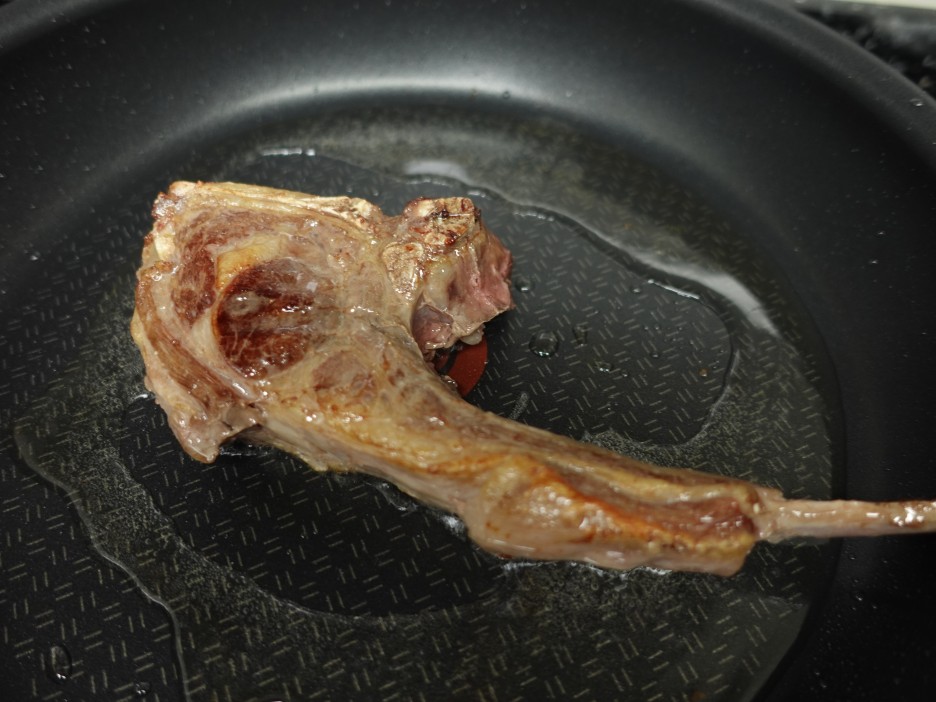 두 시간 후의 모습이구요. 고기 내부온도는 54도로 올라왔습니다. 프라이팬에 기름을 둘러주고 겉면을 리버스 시어링으로 구워서 마이아르 반응을 일으켜줍니다.