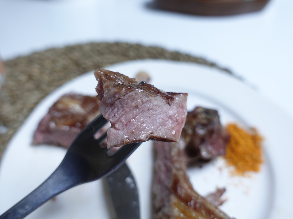 리버스 시어링이 끝나면 잠시 레스팅 과정을 거쳐주고 바로 시식! 고기 안 쪽을 한번 잘라보면 ..