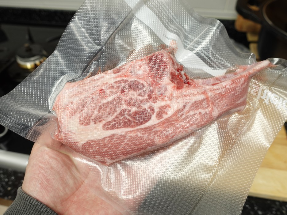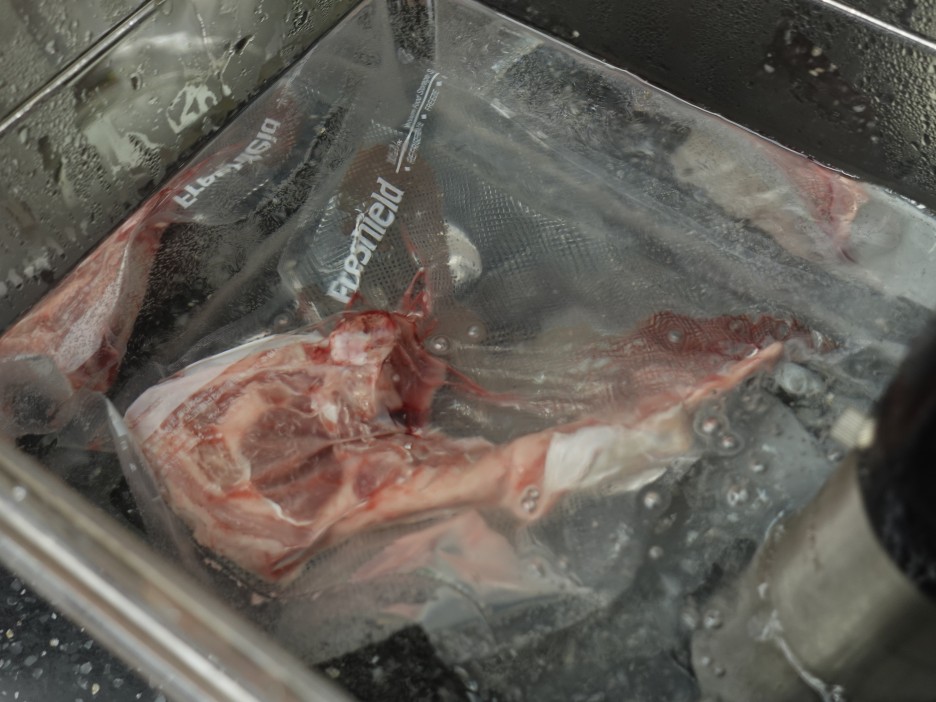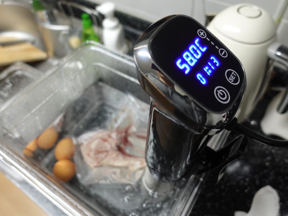 한 덩어리는 수비드로 한 번 조리해서 먹어보려고 수조에 물을 올렸구요. 시간은 2시간 온도는 58도로 설정해주었습니다