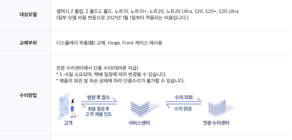 후면액정 비용이 4천원이라니.. 생각보다 너무 저렴하게 교체할 수 있어서 기분이 너무 좋더라구요.스마트 펜겸 누르면 실제 펜심이 튀어나오는 볼펜도 서비스로 주셔서 더 기분이 좋았습니다. 갤럭시액정수리비 가 21년 1월부터 변경된것도 알 수 있었는데요. 아래는 삼성공홈에 명시되어 있는 액정수리비 표입니다.