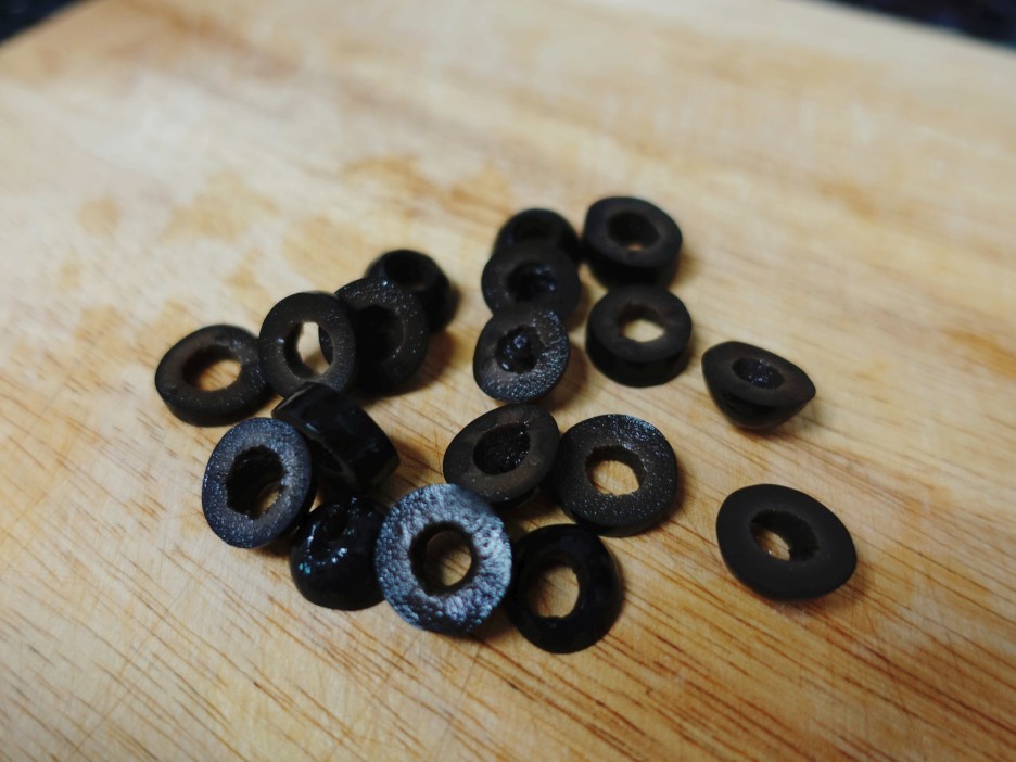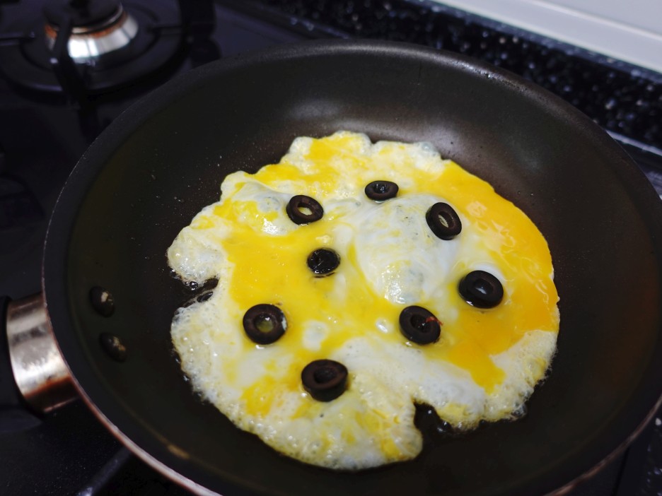먼저 계란을 풀고 기름을 두른 팬뒤에 스윽 부어 준 뒤에 슬라이스 된 올리브를 위에 뿌려주시구요.