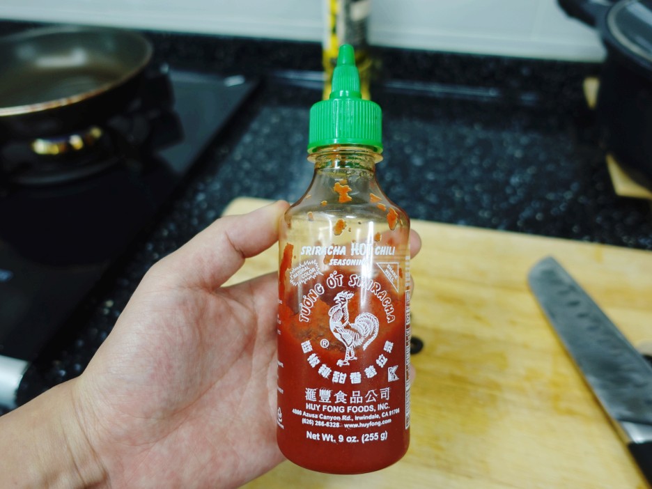 그 위에 눈꽃치즈를 골고루 뿌려주고 스리라차 소스를 슥슥슥 뿌려주고