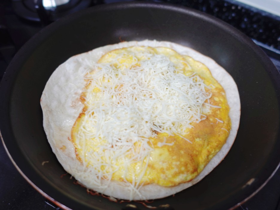 이런 식으로 위쪽에 또띠아를 받쳐서 거꾸로 샥! 뒤집어 주어서 또띠아가 아래로 오게 해줍니다.