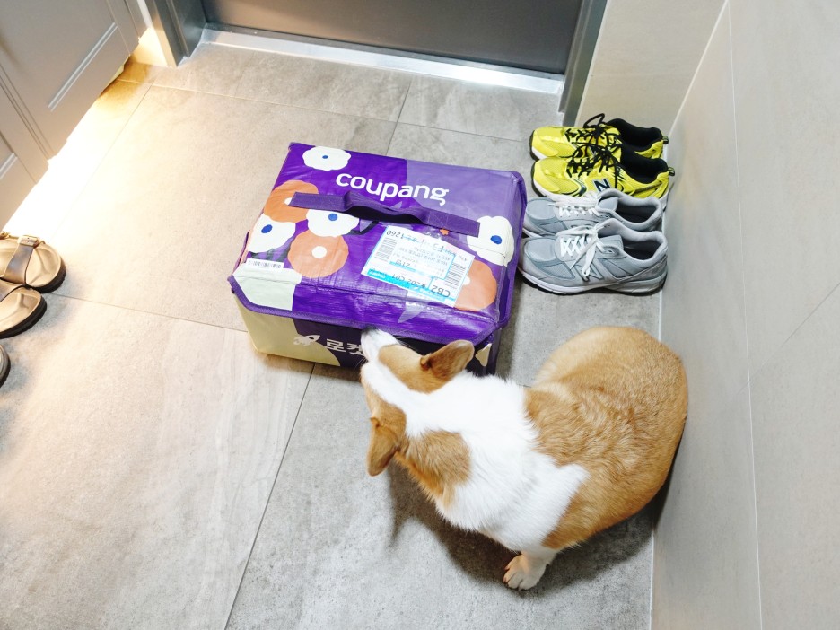 짜잔.. 등장한 로켓프레시 가방에 급 관심을 보이는 하늘님. 보통 소량으로 시킬때는 박스나 스티로폼 박스에 드라이 아이스 팩과 함께 제품들이 동봉되어 왔는데 이번에는 로켓프레시 가방이 친히 와서 기분이 좋았습니다.