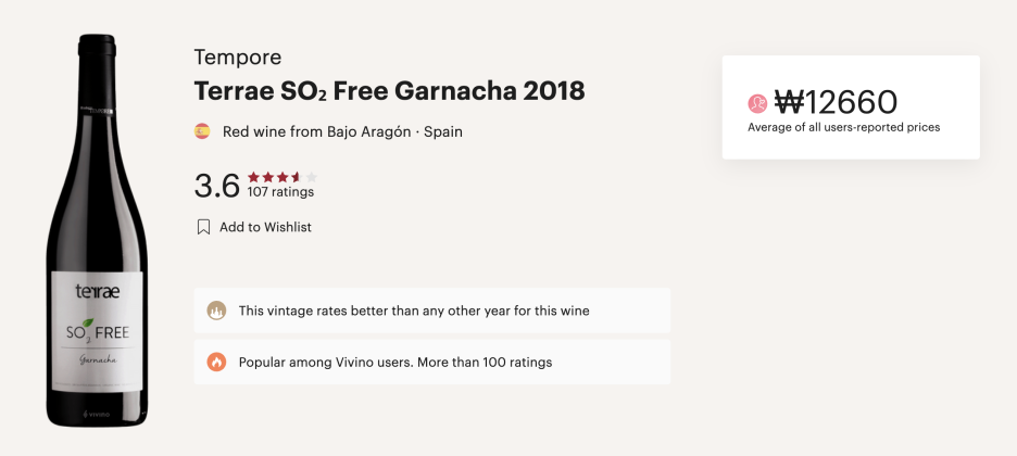 비비노에서는 템포레 So2 프리 가르나차 2018 제품은 총 107명의 사람들에게 평점 3.6점을 받았구요. 많은 사람들의 평가로 평균 별점 3.6을 받은 와인이라고 볼 수 있겠습니다.