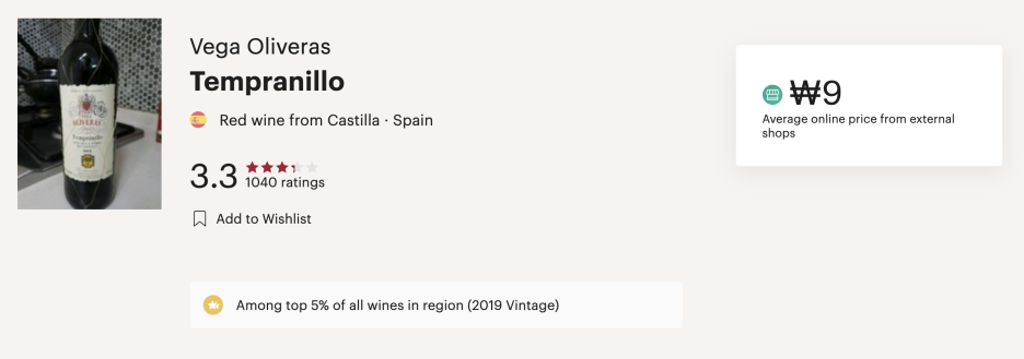 비비노에서는 아르코 베가 올리베라스는 총 1040명의 사람들에게 평점 3.3점을 받았구요 많은 사람들의 평가가 별점 3.3 을 받은 와인이라고 볼 수 있겠습니다. 보통은 3.5 별점 이상 와인만 구매하는데 이 와인은 제가 좋아하는 템프라니요 품종이기도 하고 가격도 9천 원대로 구매가능해서 집어오게 됐습니다.