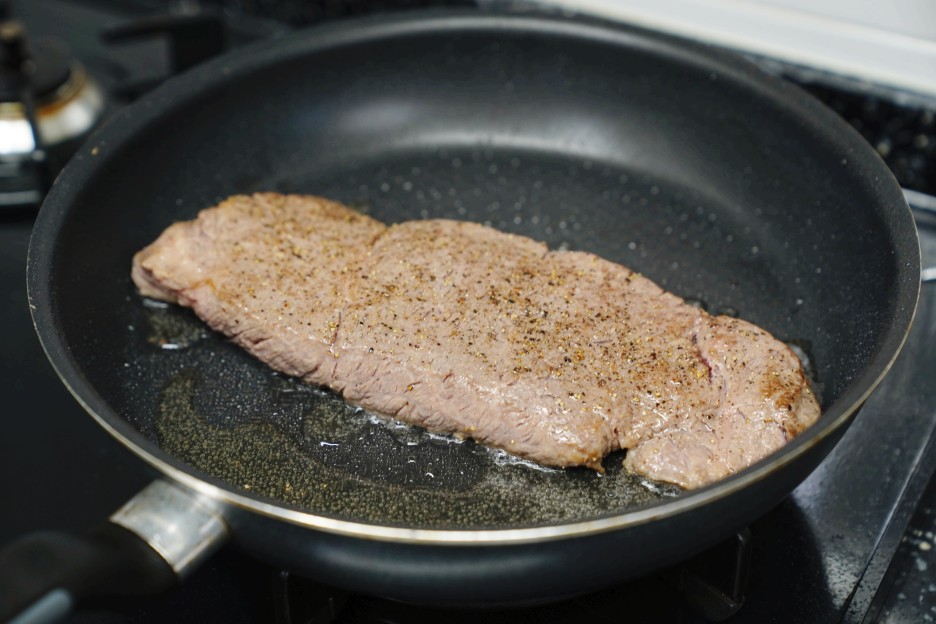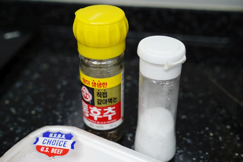 이후에 이렇게 소금과 후추로 간을 해주시구요. 팬에 기름을 두르고 처음에 충분히 팬을 예약해준 뒤에 고기를 앞 뒤로 구워서 육즙이 빠져나가는 것을 방지해 줍니다. 이후 약불로 변경한 후 자주 뒤집어 주면서 고기를 익혀주세요.