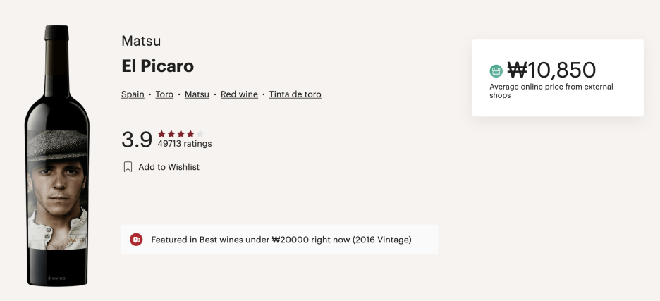 비비노에서 마츠 엘피가로 제품은 총 49713명의 사람들에게 평가를 받았구요. 평균 별점은 3.9을 받은 와인이고 나쁘지 않은 평점을 받은 와인이라고 생각합니다.