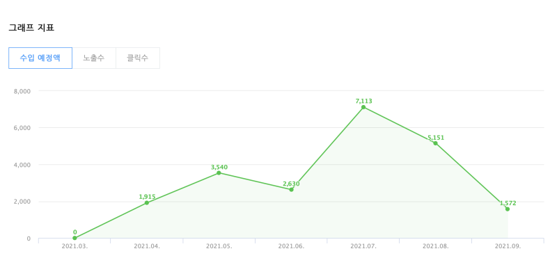 그래프 세부지표를 보면 3월 달에는 글이 얼마 모이지 않은 시점으로 0원에서 출발해서 글이 점점 모이고 제 블로그에 들어오는 접속자들이 늘어나면서 수입도 함께 증가하는 모습을 볼 수가 있습니다.