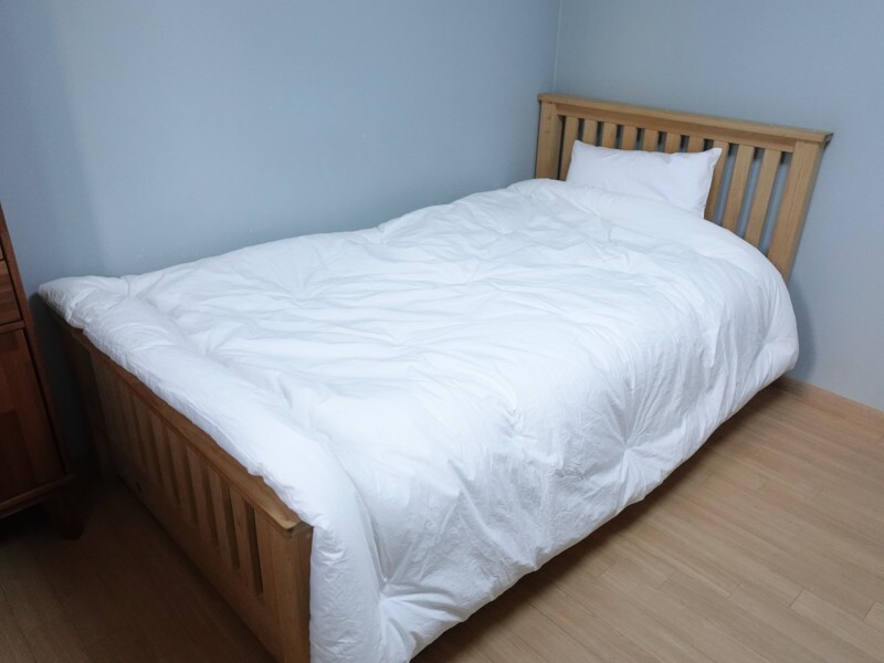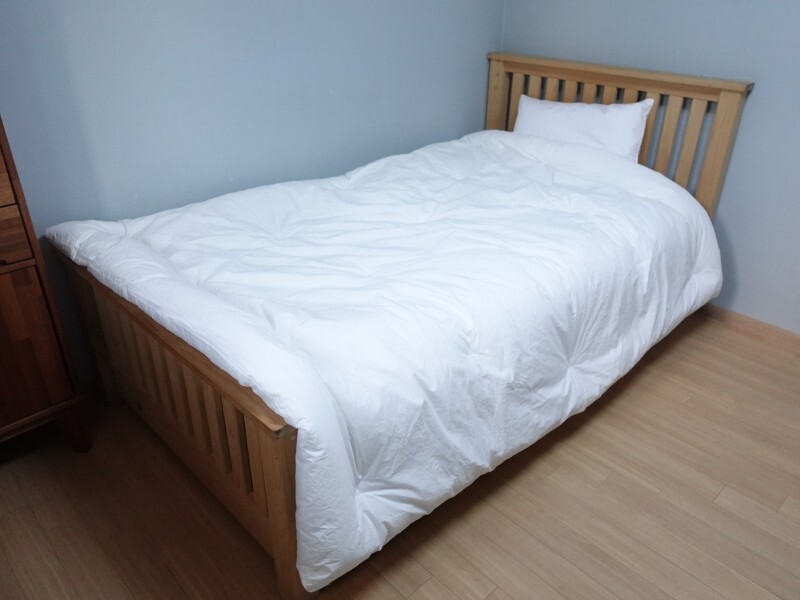 기존에 있던 패드는 교체해주고 새 이불과 새 베개를 덮은 모습입니다. 이불은 침대 사이즈에 비해 넉넉하게 조금 더 큰 사이즈를 골랐는데요. 한 달여 정도 사용하고 나니 정말 만족스럽습니다. 차렵이불 특유의 뽀시락 뽀시락 거리는 감촉도 굉장히 좋구요.