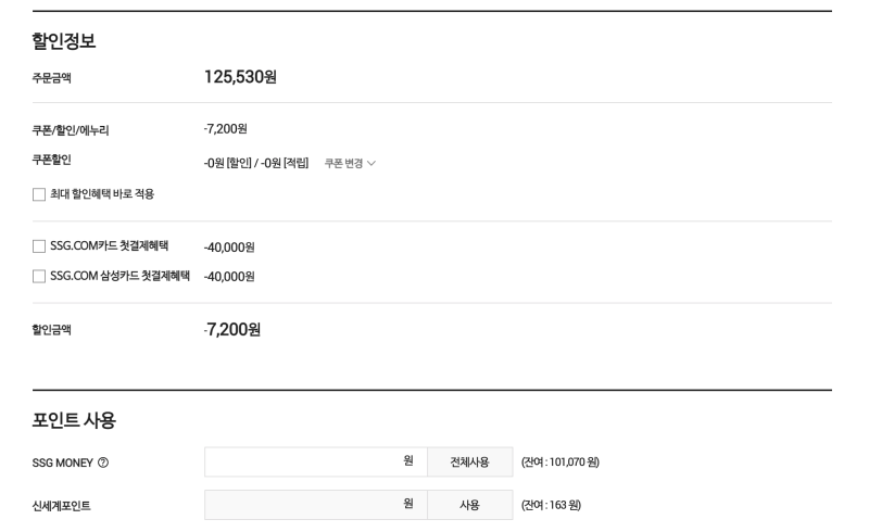 신세계 상품권 10만원 포인트로 전환 후 추가로 있던 1070원 포인트까지 합쳐서 최종 결제 금액은 17,260원에 침대 패드와 구스베개 차렵이불까지 모두 구매 완료했습니다.