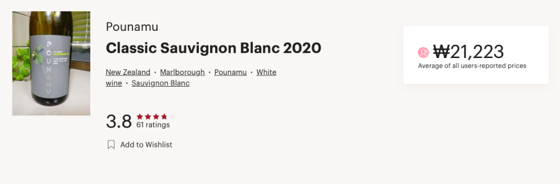 비비노에서 푸나무 소비뇽블랑 2020 제품은 총 61명의 사람들에게 평가를 받았구요. 많은 사람들의 평가로 평균 별점 3.8을 받은 와인이라고 볼 수 있겠습니다.